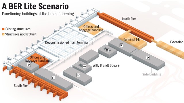 The director of the company that operates Berlin’s airports, Lütke Daldrup, has come up with a bold idea: opening a sort of BER Lite. It would be a patchwork airport, using just the two side wings as a workaround solution.